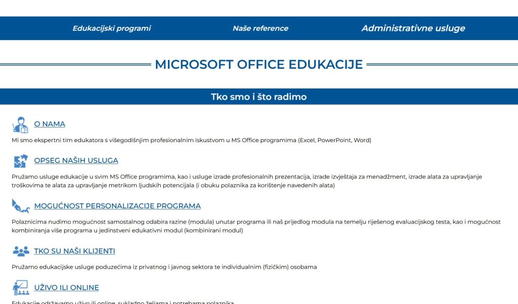 MS Office Edukacije is a specialized online platform offering professional training courses focused on Microsoft Office tools. The website aims to provide clear information about available courses, schedules, and enrollment options, targeting individuals and corporate clients seeking to enhance their digital skills.